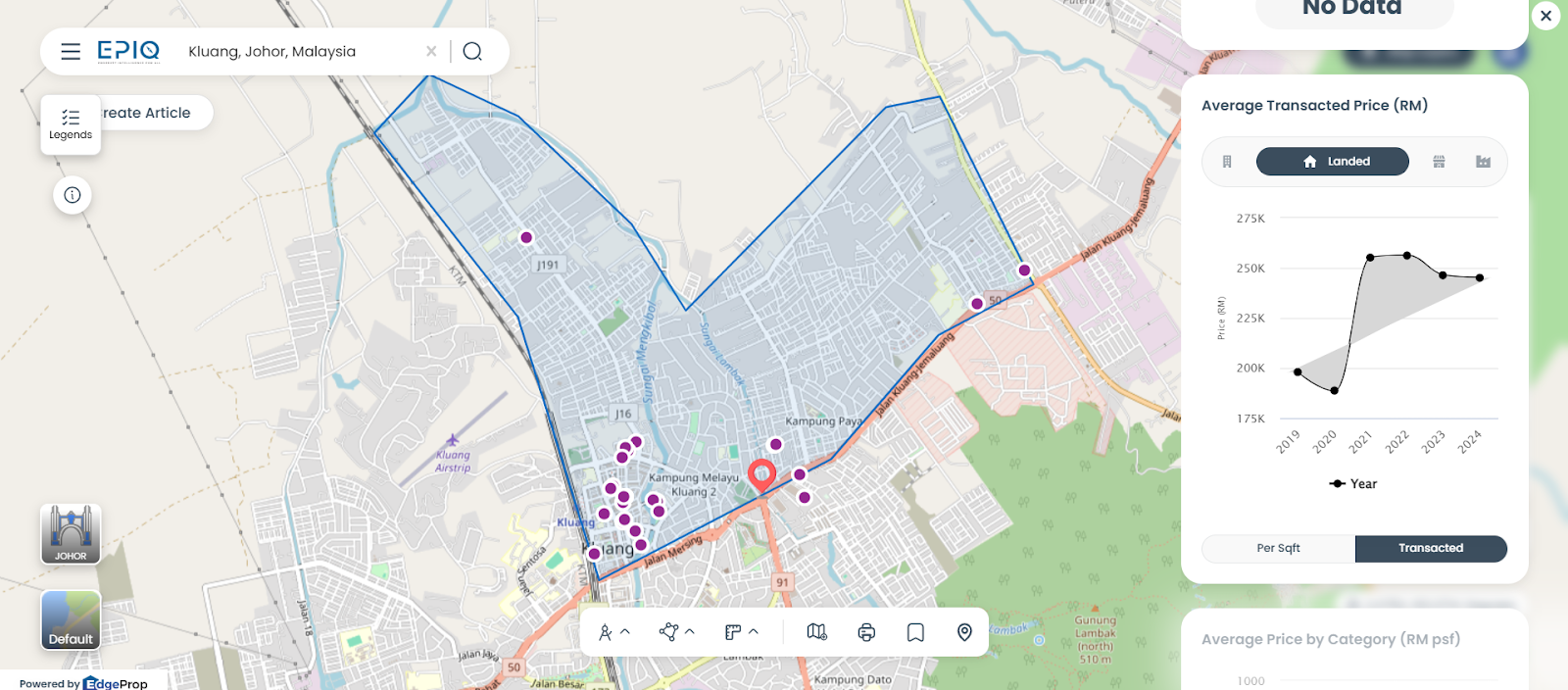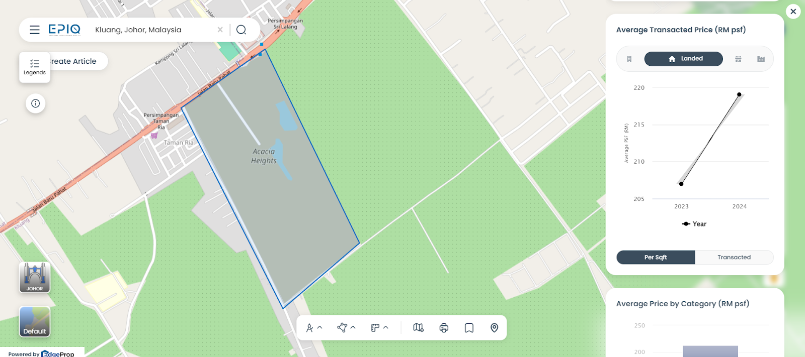Kluang’s mature taman areas continue to attract families seeking affordability. According to EdgeProp’s EPIQ data, average terrace house prices were recorded at RM246,000 in 2023 and RM245,000 in 2024, with per square foot (psf) values rising from RM141 to RM152 over the same period.
