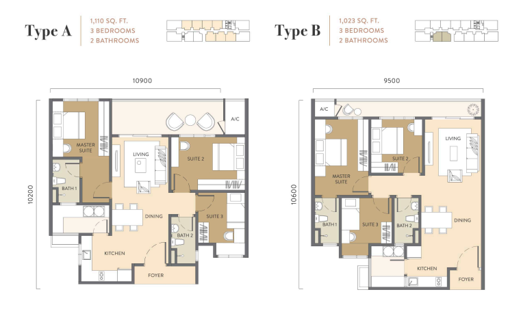 - Type A: 1,110 sq. ft. | 3 Bedrooms | 2 Bathrooms
