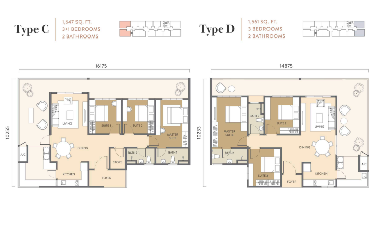 - Type C: 1,647 sq. ft. | 3+1 Bedrooms | 2 Bathrooms