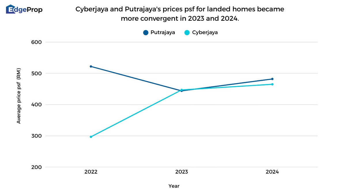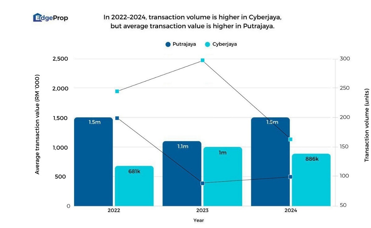 Landed transaction volumes were consistently higher in Cyberjaya. It recorded 246 landed transactions in 2022, rising to 299 units in 2023, before dropping to 164 units in 2024. In comparison, Putrajaya saw 198 landed transactions in 2022, which fell to 89 units in 2023, before a modest recovery to 100 units in 2024.