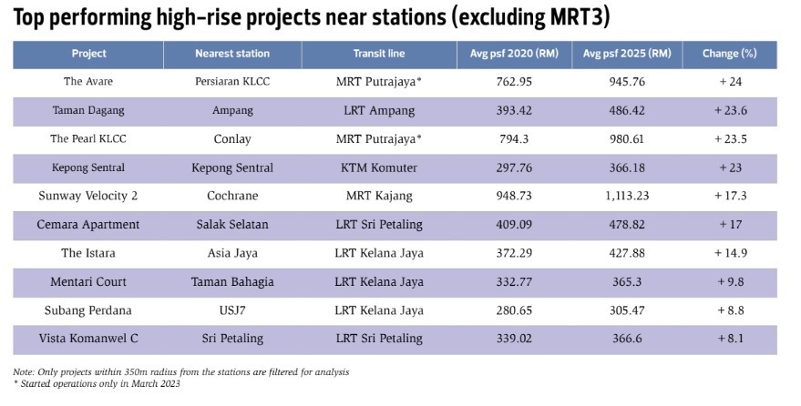 Among the high-rise projects analysed, a small group has recorded notable price appreciation over the past five years, although several variables merit closer attention. To ensure relevance, only projects with a minimum of 30 transactions were filtered; and while most of the stations were operational before 2020, MRT Putrajaya’s first and second phases only commenced in 2022 and 2023 respectively.