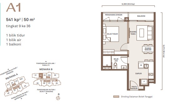 - Type A (541 sq ft) – 1 Bedroom, 1 Bathroom
