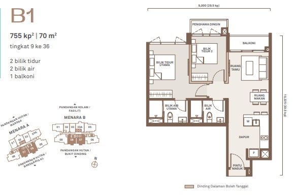 - Type B (755 sq ft) – 2 Bedrooms, 2 Bathrooms