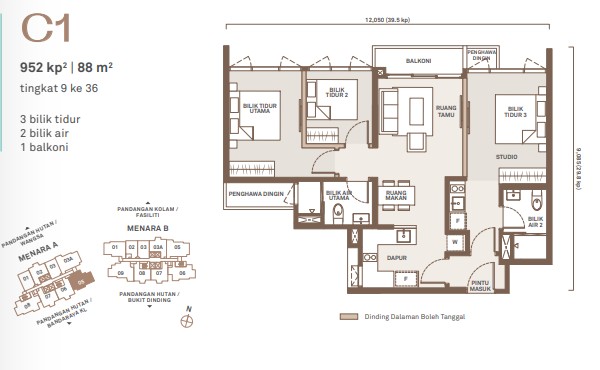 - Type C (952 – 997 sq ft) – 3 Bedrooms, 2 Bathrooms