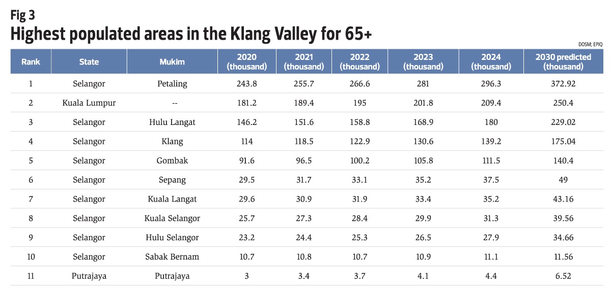 Keeping our attention on the Klang Valley — Malaysia’s most urbanised region with a population exceeding 8.4 million — data from EdgeProp EPIQ helps us identify key districts where senior citizens are already clustered in significant numbers.