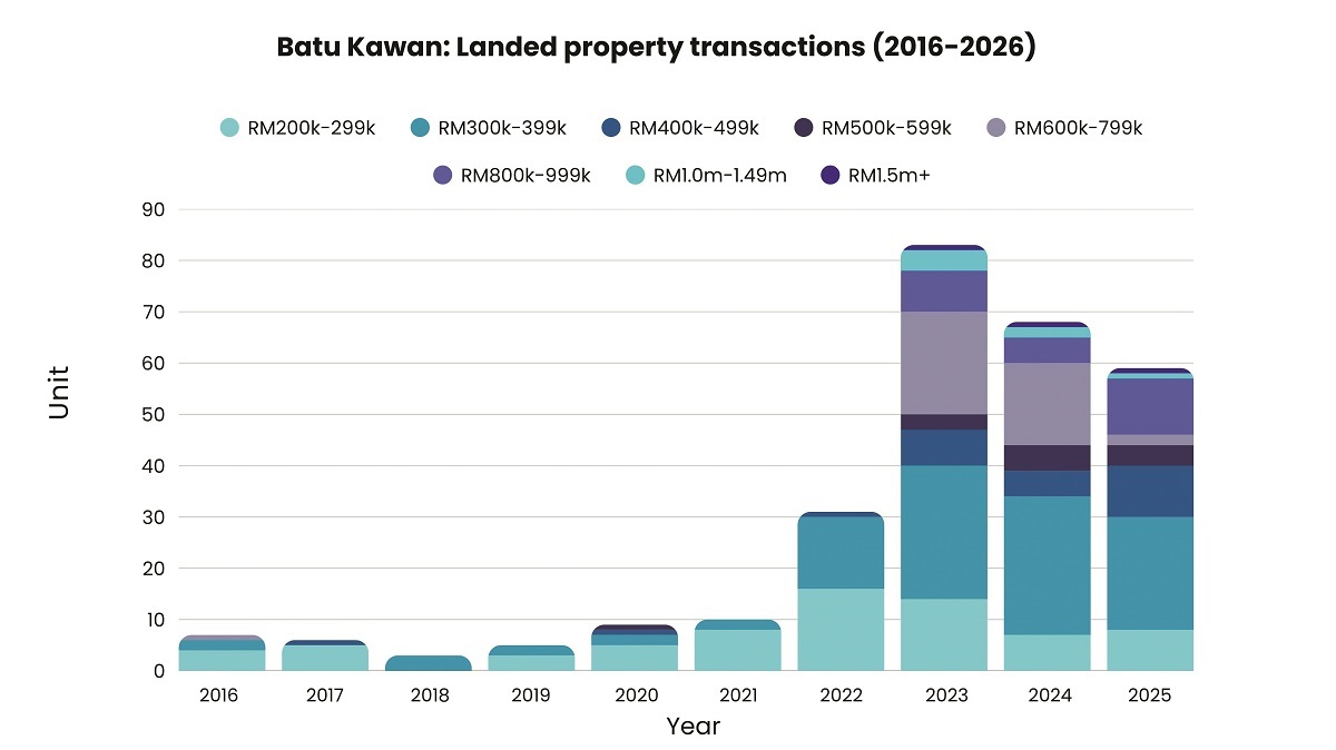 Beyond high-rise units, a longer-term view of landed transactions across Batu Kawan points to a gradual shift in price distribution. Earlier transactions were concentrated within the RM200,000–RM400,000 bands, but over the past five years up to December 2025, there has been a clear migration towards higher price brackets, particularly above RM500,000.