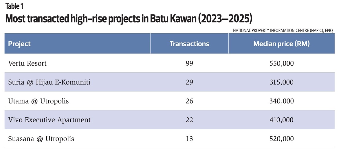 Over the latest 24-month period up to December 2025, captured in the EdgeProp EPIQ’s dataset, several high-rise residential developments have recorded varying levels of transaction activity. Vertu Resort led in terms of volume, followed by Suria @ Hijau E-Komuniti and Utama @ Utropolis.