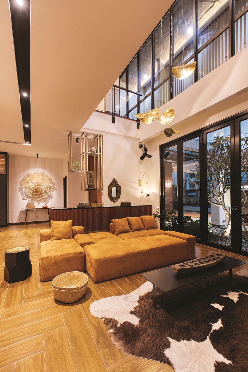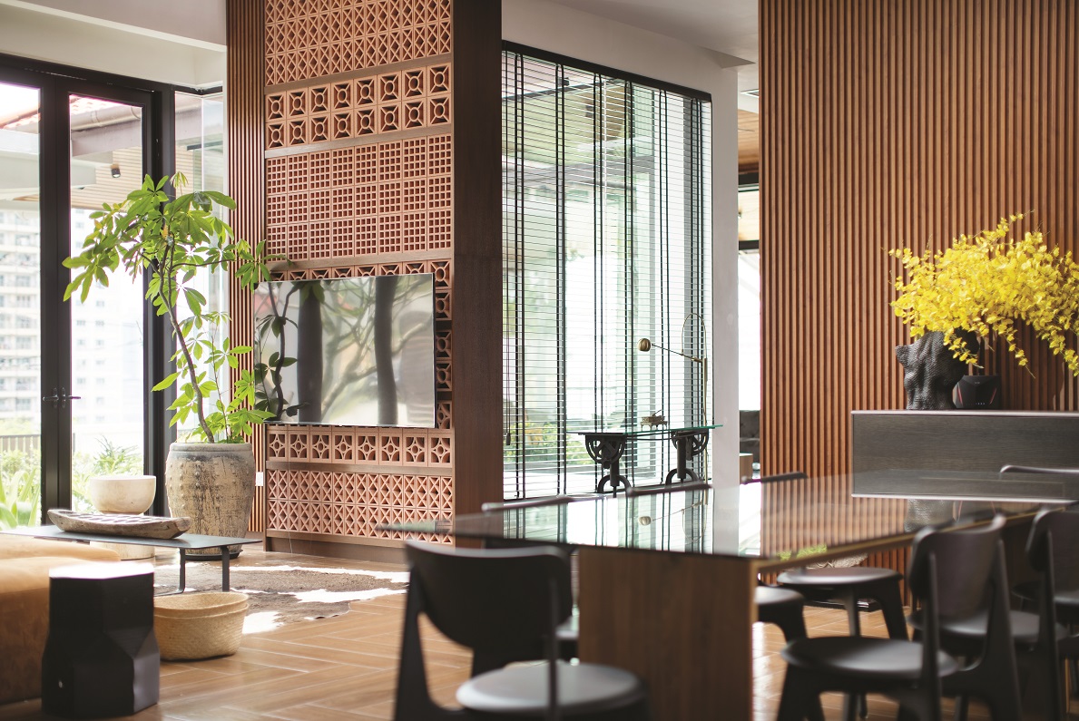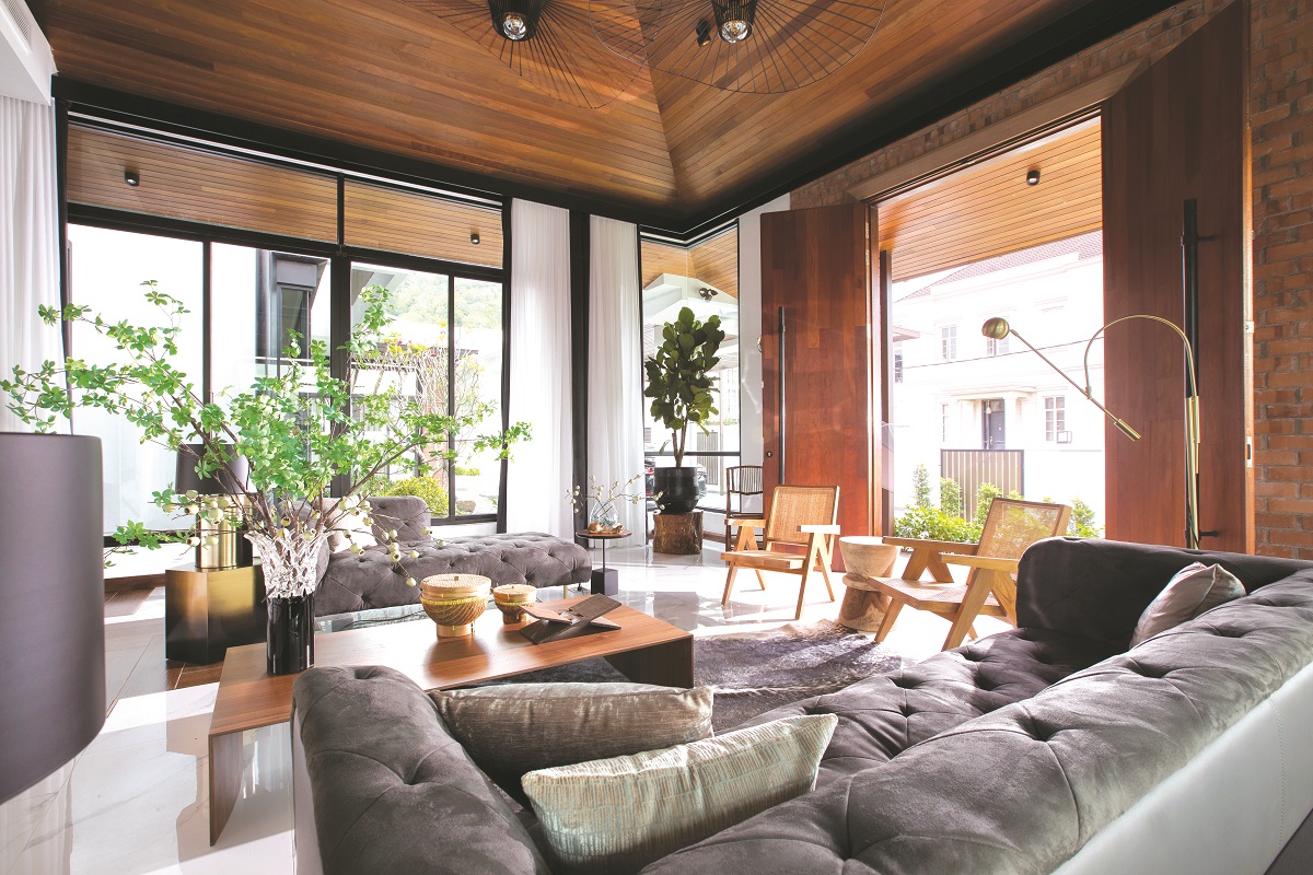 Real timber encases selected spaces, including the formal living area, where the marble flooring is paired with timber-lined ceiling, rendering an elegant and more composed setting for guests.