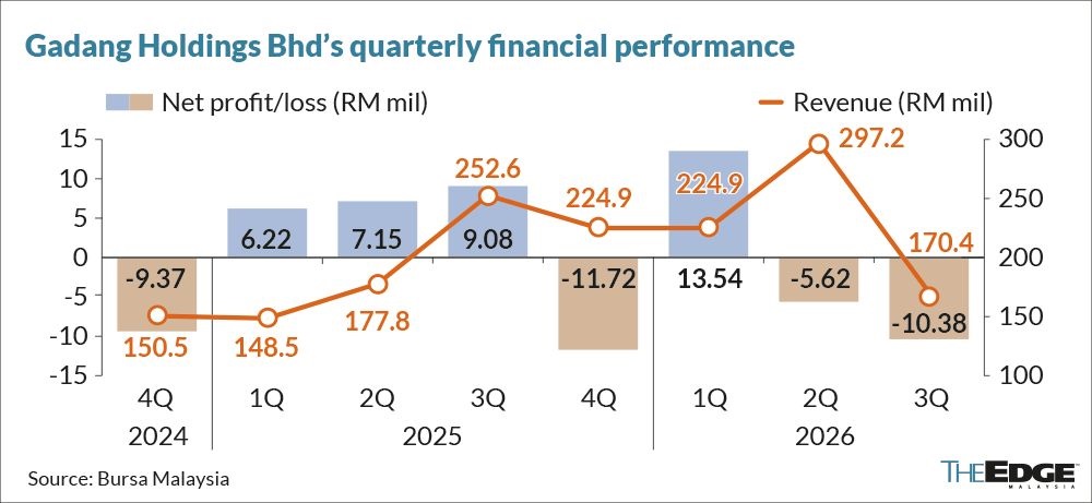 KUALA LUMPUR (April 17): Gadang Holdings Bhd (KL:GADANG) has posted a net loss of RM10.38 million for its third financial quarter ended Feb 28, 2026 (3QFY2026), a reversal from a net profit of RM9.08 million a year earlier, after it was hit by additional costs.